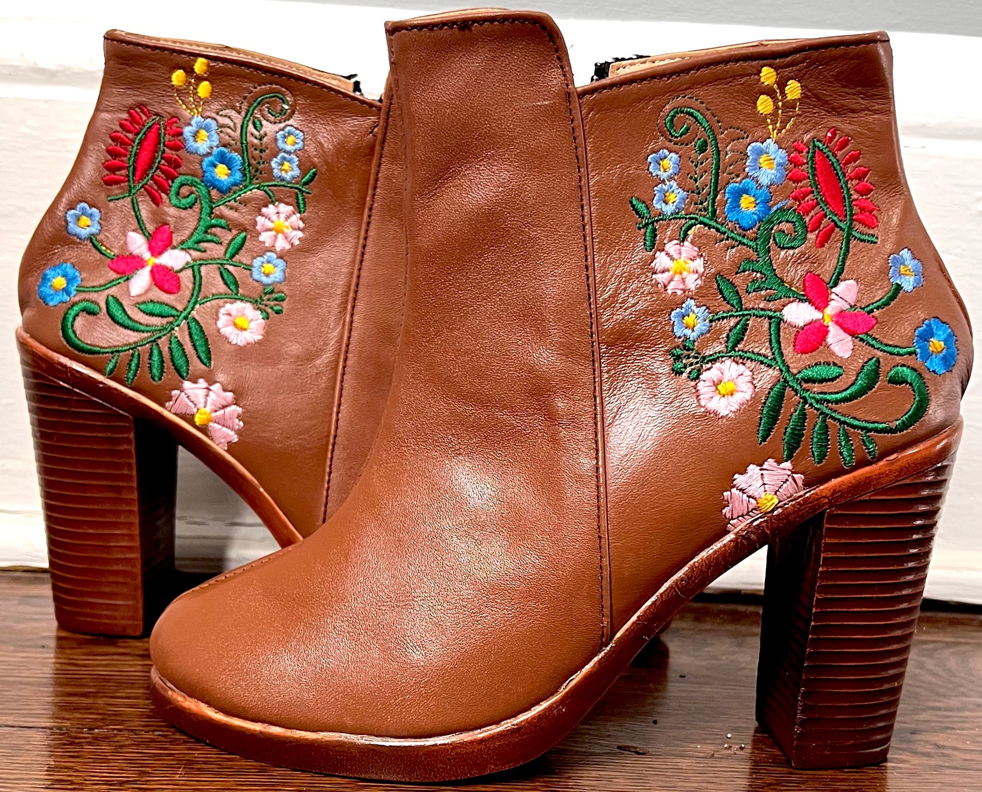 These booties are real leather and do not come in 1/2 sizes. They will stretch a little so we recommend to size down if you are in between sizes.